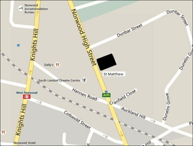 Bus and Rail links West Norwood Railway Station is less then 5 minutes walk from the Church.